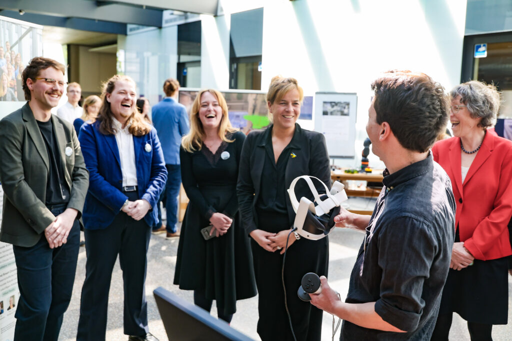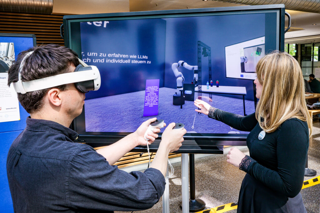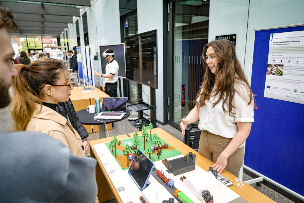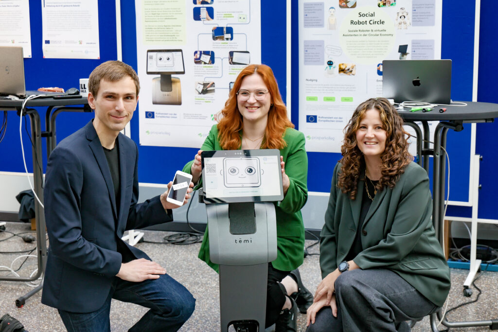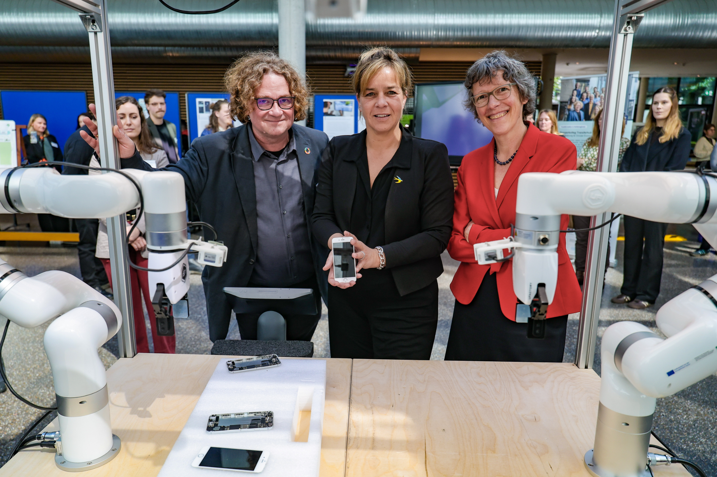 Während ihres Rundgangs entlang unseren praxisnahen Anwendungsbeispiele gewann die Ministerin Einblicke in digitale und zirkuläre Lösungen zur effizienteren Materialnutzung, Prozessautomatisierung und Transparenz von Wertschöpfungsketten: vom digitalen Produktpass, der mit KI und Blockchain Produktlebenszyklen und Lieferketten fälschungssicher erfasst, über Kreislaufchecks für handwerkliche Betriebe bis hin zu Assistenzrobotern, die Menschen bei Reparaturen unterstützen. KI-gestützte Sortiertechnik und robotisierte Verfahren zeigten, wie Materialien präzise zurückgewonnen werden können. Mit Virtual Reality und Microlearnings wurde Wissen zur Circular Economy niedrigschwellig und immersiv vermittelt, ein zentraler Baustein für Verständnis und Beteiligung.